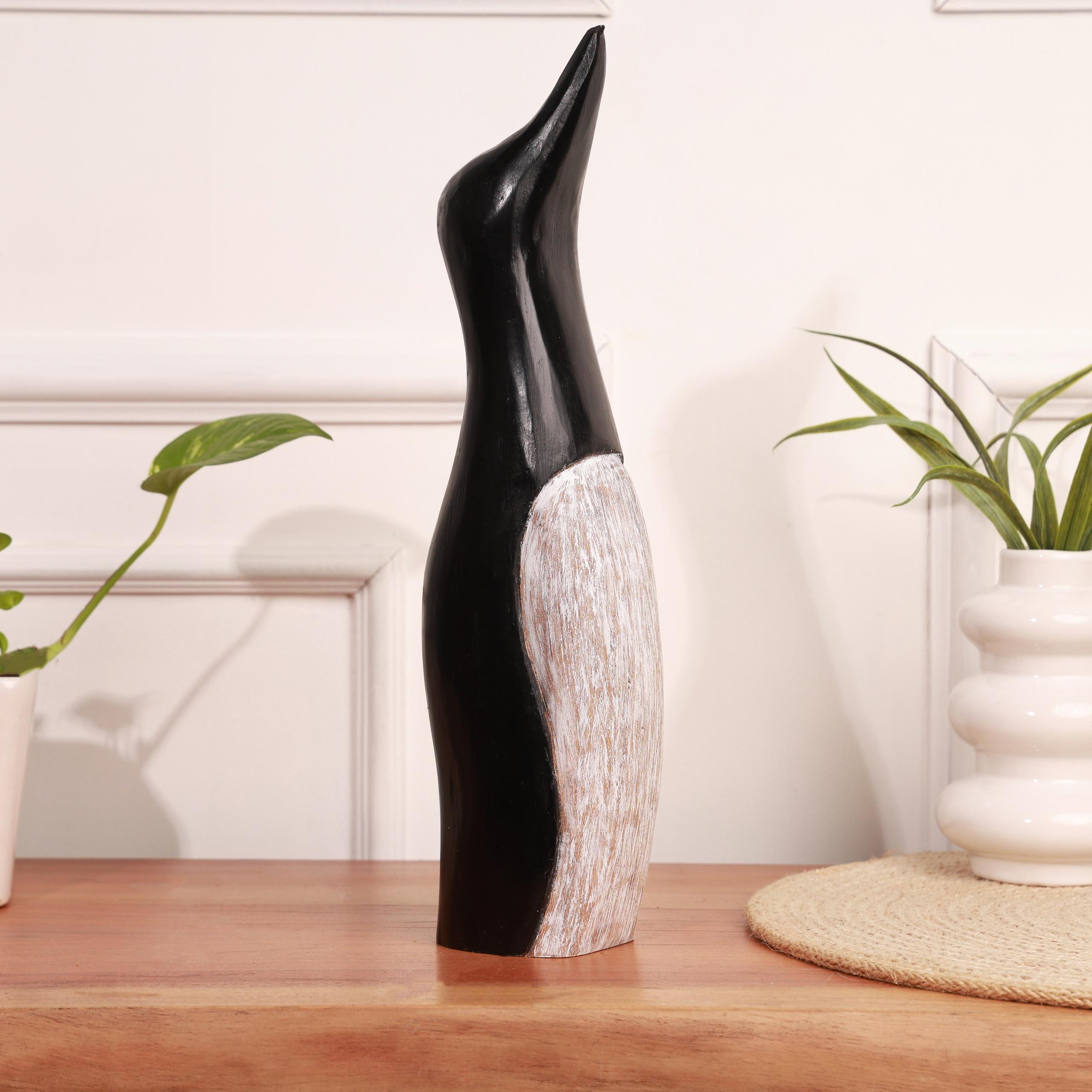 The wooden ebony penguin is a sleek and minimalist decorative piece carved from rich black ebony wood. Its smooth, polished surface highlights the wood's natural grain, adding an elegant texture to its design. The penguin's simple, abstract shape captures the essence of the bird with a modern aesthetic. Perfect as a tabletop or shelf ornament, it blends effortlessly with contemporary or rustic decor. This handcrafted piece is both a charming gift and a timeless addition to any collection. 4x3x15" , Black , Wood |
