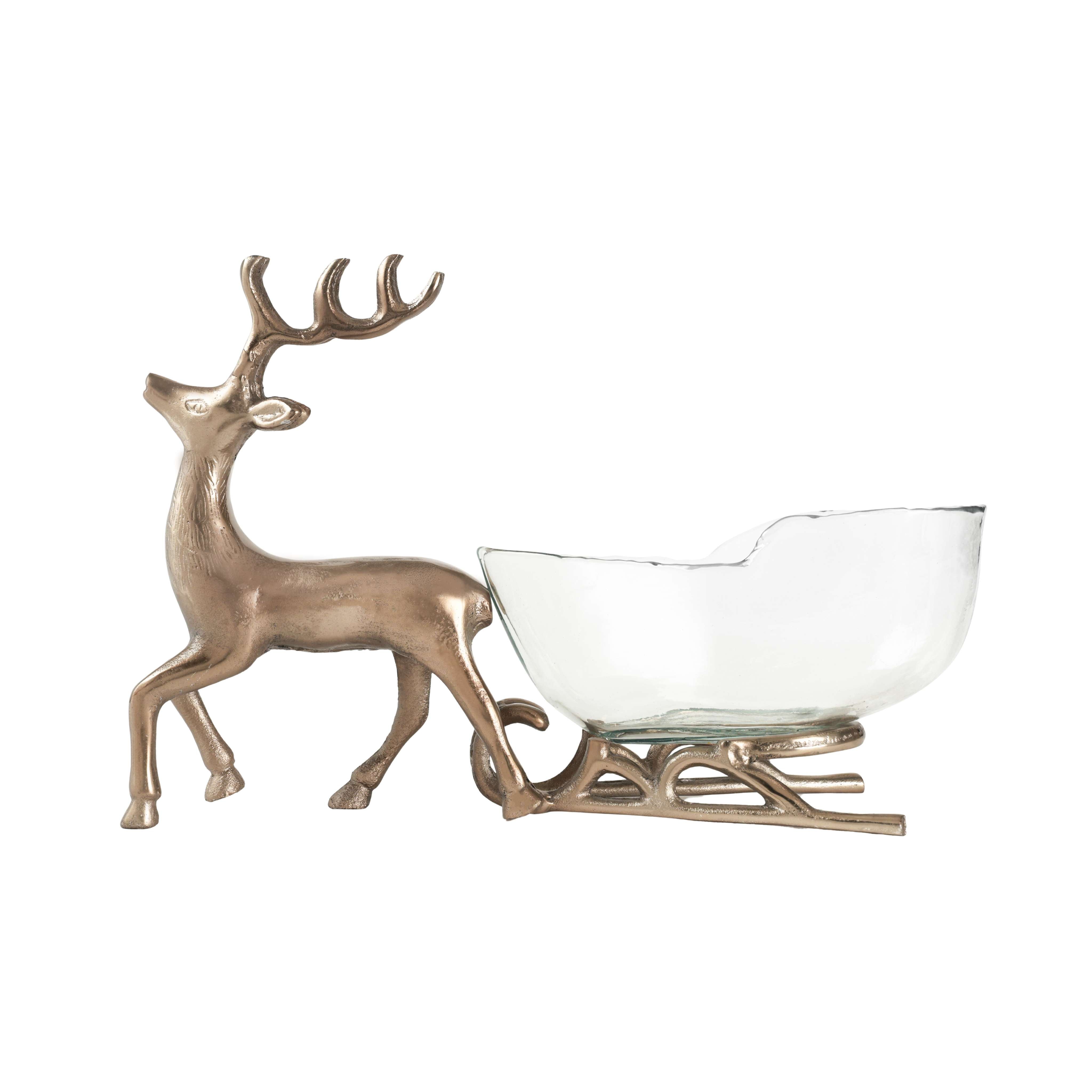 | The Nordelle Sleigh is a beautifully crafted décor piece made from a refined blend of metal and glass in an elegant silver colour. Designed in the shape of a classic holiday sleigh, it brings a touch of festive charm and sophistication to any space. The sleek metal reindeer offers durability and structure, while the glass sleigh adds a delicate, luminous quality that catches and reflects ambient light. Its versatile design makes it perfect for displaying ornaments, candles, potpourri, or seasonal accents. Ideal for mantels, consoles, or center tables, this sleigh adds a timeless, decorative touch to your holiday décor with its graceful and polished aesthetic. 16X5X10",Metal Glass,Silver |